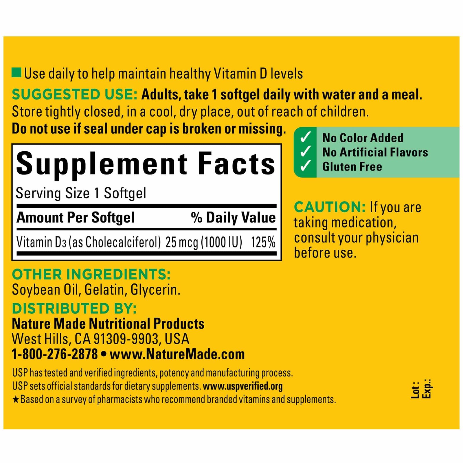 • Sourced from high-quality ingredients, this Nature Made Vitamin D3 supplement has no color added and no artificial flavors