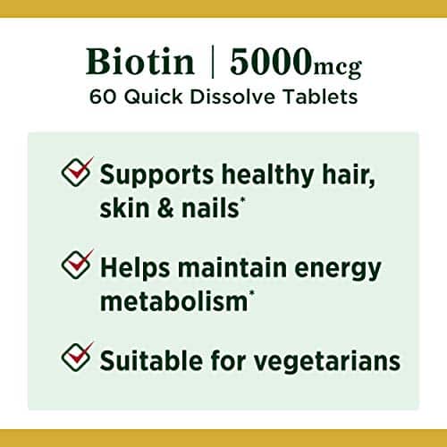Nature’s Bounty B Vitamins support cellular energy by converting food into energy.(1) Nature’s Bounty Biotin 5000 mcg, 60 Quick Dissolve Tablets. Quick Dissolve Pill. Supports Healthy Hair, Skin, and Nails. Energy support. (1)These statements have not been evaluated by the Food and Drug Administration. This product is not intended to diagnose, treat, cure or prevent any disease.Packaging may vary due to redesign, same great product ingredients.