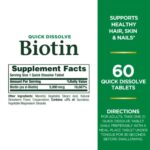 - HAIR, SKIN & NAIL HEALTH 60-count, 5000mg quick-dissolve tablets. Biotin is the one of the most commonly used hair, skin and nails vitamins. Our Biotin 5000mg Tablets are an easy way to help support and maintain healthy hair and radiant skin.(1)