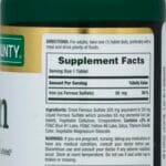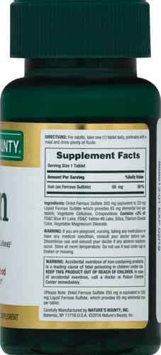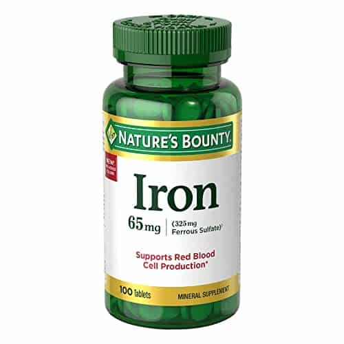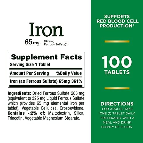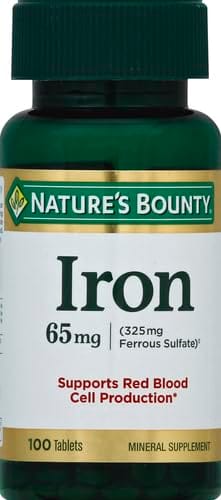 Nature?s Bounty Iron 65 mg is a safe daily supplement that supports red blood cell production and helps maintain cellular energy utilization. (1) Iron is also a vital component of hemoglobin, the oxygen carrier in the blood. (1) An essential mineral, Iron is especially important for women?s nutritional health. (1) One 325 mg tablet of Ferrous Sulfate supplies 65 mg of elemental Iron. Each pack contains 100 tablets.