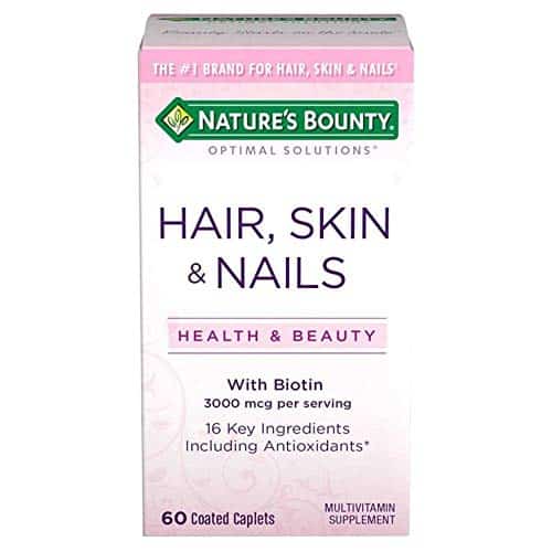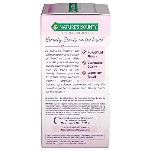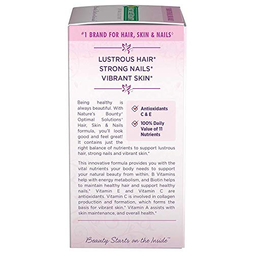 Nature?s Bounty Optimal Solutions Hair, Skin & Nails formula, you?ll look good and feel great! It contains just the right balance of nutrients to help support lustrous hair, strong nails and vibrant skin. This innovative formula provides you with the vital nutrients your body needs to support your natural beauty from within. B Vitamins help with energy metabolism, and Biotin helps to maintain healthy hair and promote healthy nail growth by acting at the base of the nail ? the nail matrix ? where nail growth begins. Vitamin E and Vitamin C are antioxidants. Vitamin E contributes to skin health, and Vitamin C is involved in collagen production and formation, which forms the basis for vibrant skin. Vitamin A assists with skin maintenance, and overall health.