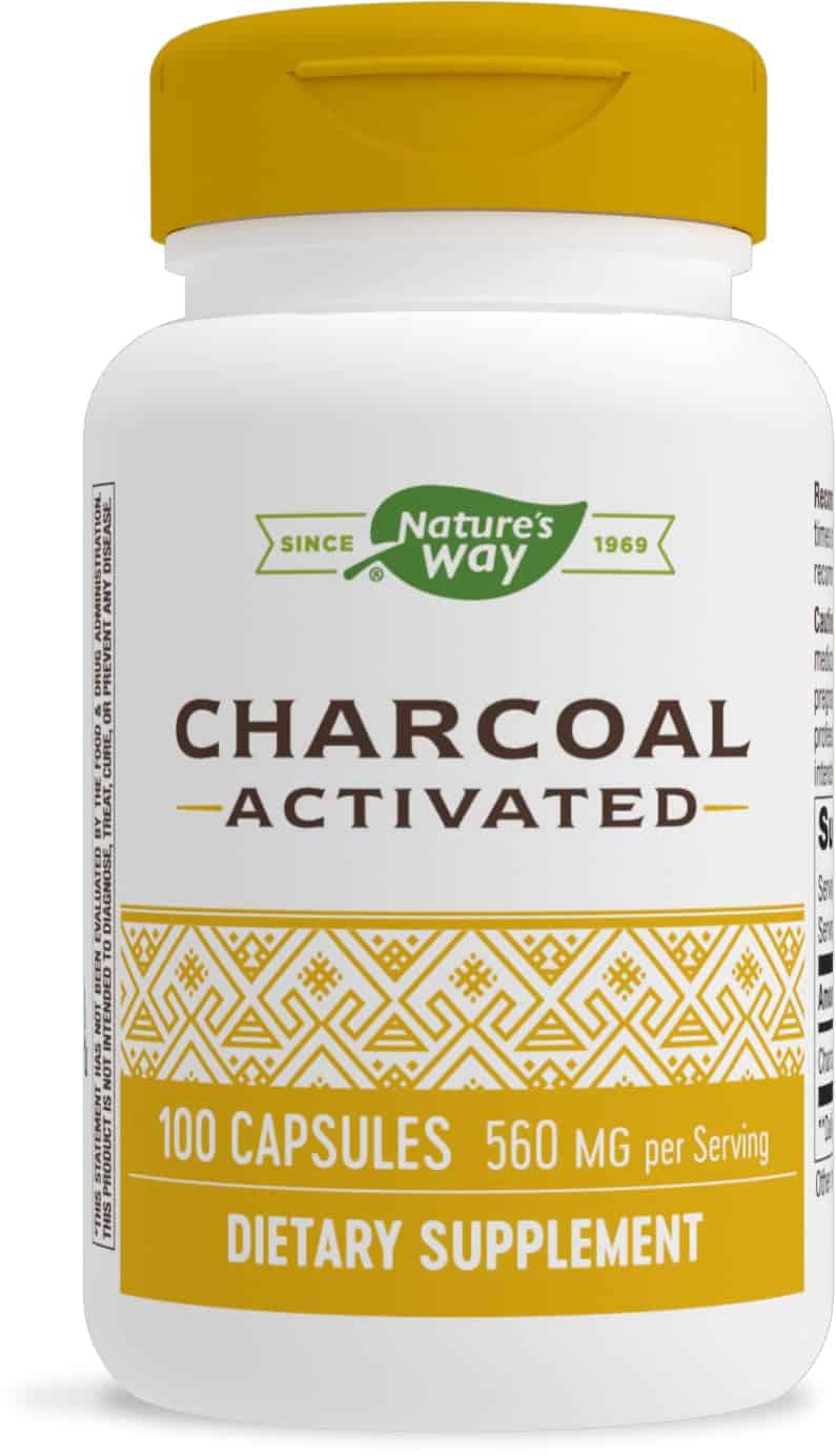 - Nature’s Way Activated Charcoal contains 560 mg of charcoal per 2-capsule serving, which binds to unwanted materials and gas in the digestive tract*
