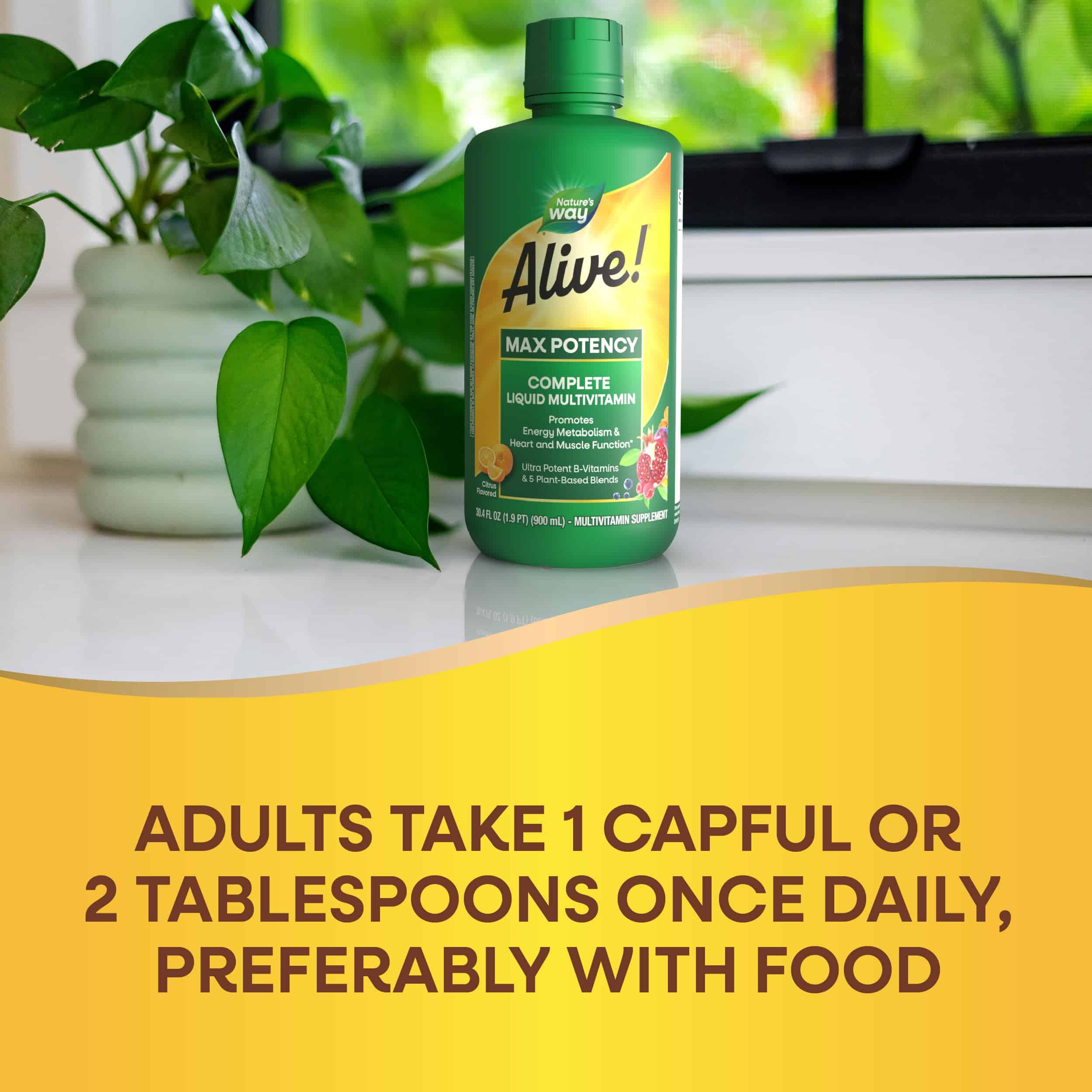 - Nature’s Way Alive! Max Potency Complete Liquid Multivitamin promotes daily wellness, including energy metabolism , heart health and muscle function.*