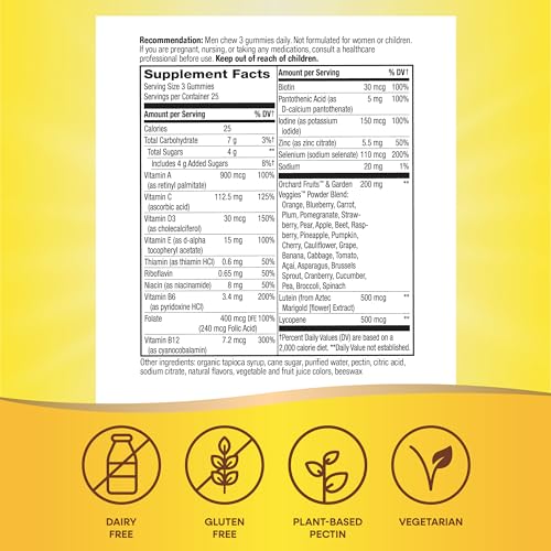 Nature’s Way Alive! Men’s 50+ Premium Gummy Multivitamin supports healthy heart, brain, and muscle function.* Made with 15 essential vitamins and minerals, including the full B-vitamin complex to help convert food into fuel.* With high potency vitamins C, D3, and selenium per 3-gummy serving. With food-based Orchard Fruits & Garden Veggie powder blend (200 mg per 3-gummy serving).*This statement has not been evaluated by the Food and Drug Administration. This product is not intended to diagnose, treat, cure, or prevent any disease.