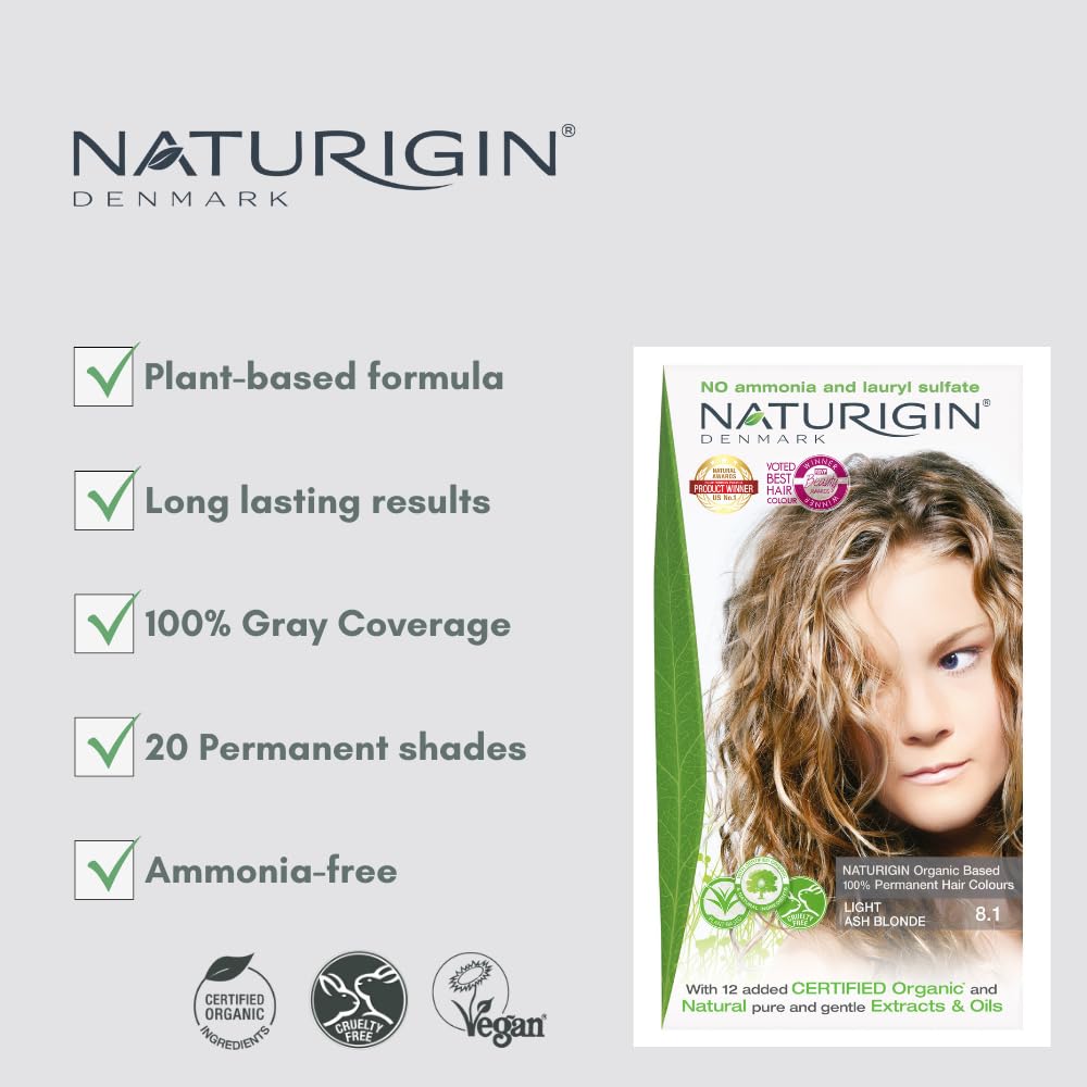Original price was: ₹14,533.₹10,765Current price is: ₹10,765.Naturigin Permanent Hair Dye, 8.1 Light Ash Blonde, Ammonia and Paraben Free, up to 100% Gray Hair Coverage, Long Lasting, Vegan, Cruelty Free