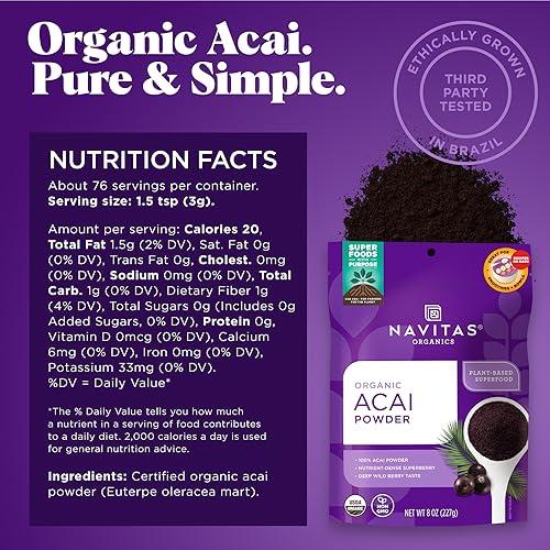 Navitas Organics Acai Powder is premium quality, freeze-dried and gently milled organic acai berries, hand-harvested from their native Brazil. A staple in the diet of indigenous cultures for centuries, acai (ah-sigh-ee) is a delicious low-glycemic berry that is abundant in health-supportive antioxidants, essential omega fats, and fiber. With a flavor somewhere between chocolate and wild berries, Navitas Organics Acai Powder is delicious in smoothies, oatmeal, baking and dessert recipes?and of course, the most important ingredient in an Acai Bowl! Contains no fillers or added ingredients. USDA Organic, non-GMO, Kosher, vegan and gluten-free.