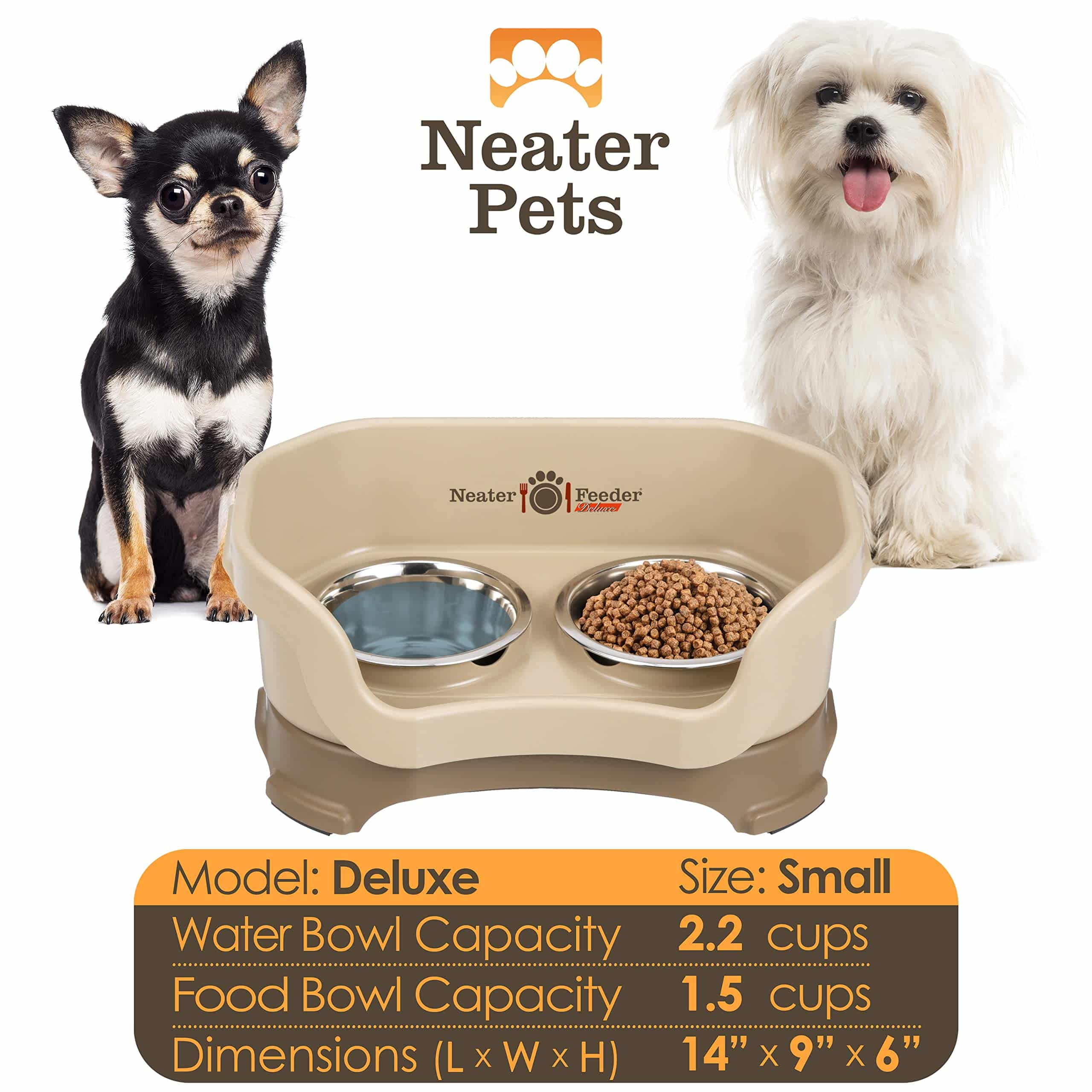 • MADE FOR SMALL DOG BREEDS – Designed for smaller dog breeds like Chihuahuas and Terriers. The Neater Feeder has a 3? feeding height (at bowl rim) that is ideal for your dog?s comfort. It also has a contoured design that allows easy access to the bowl area. Includes (1) 1.5 cup food bowl and (1) 2.2 cup extra capacity water bowl.