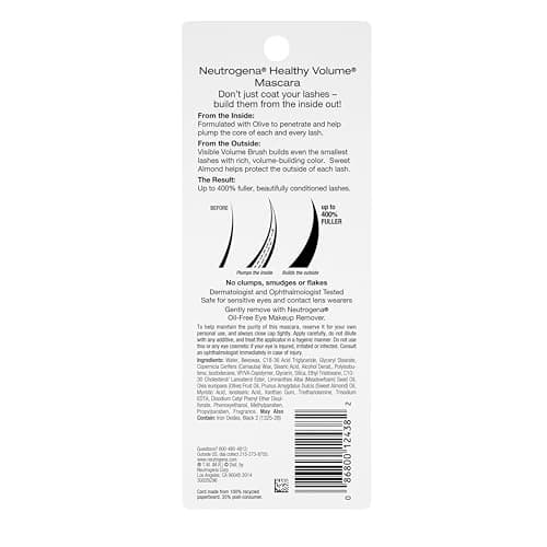 Build beautiful lashes from the inside out with Neutrogena Healthy Volume Lash-Plumping Mascara. From the inside, this rich conditioning formula penetrates and helps plump the core of every lash. On the outside, the Super-Sized Visible Volume brush coats each lash with bold, volume-building color–no clumps, smudges, or flakes. The volumizing mascara formula contains a touch of olive oil for up to 400 percent fuller, more beautifully conditioned lashes, and sweet almond to protect the outside of each lash. This dermatologist- and ophthalmologist-tested mascara is safe for sensitive eyes and contact lens wearers. Plus, it comes in three beautiful shades. Easily remove the mascara with Neutrogena Oil-Free Eye Makeup Remover or soap and water.