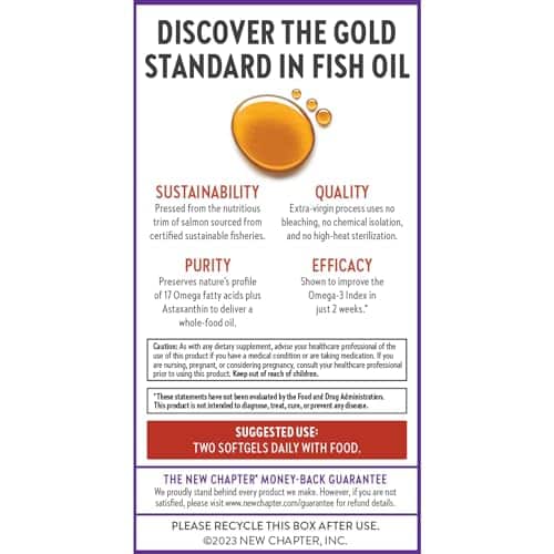 New Chapter brings you the gold standard in fish oil. Wholemega Fish Oil Supplements have been clinically shown to improve the Omega 3 Index in just 2 weeks. Each 2000 mg dose whole-food salmon oil is fresh-pressed to deliver 17 Omega fatty acids (including vital Omega-3s DHA & EPA) for better absorption, plus naturally occurring Vitamin D3. Using 100% sustainably caught Wild Alaskan Salmon helps solve the severe environmental problems caused by typical overfishing and ocean trawling. Made with Non-GMO salmon oil: No krill oil, no anchovies or sardines, no cod liver oil, no exploited fisheries, no farmed fish. (Packaging may vary) *These statements have not been evaluated by the Food and Drug Administration. This product is not intended to diagnose, treat, cure, or prevent any disease.