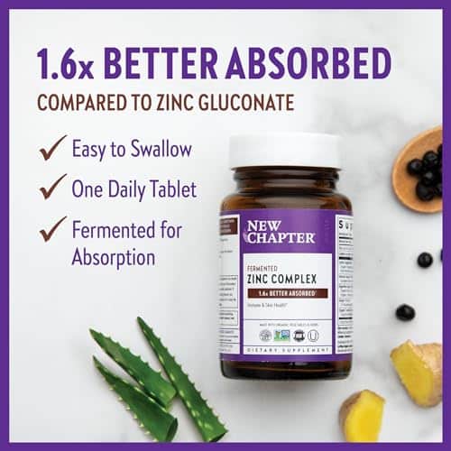 Meet the immune-supportive and skin-nourishing Zinc supplement that your body can really, truly absorb.* Formulated with fermented Zinc that is shown in clinical research to be 1.6x better absorbed+, this easily digestible, one daily, easy to swallow Zinc supplement is gentle even on an empty stomach. We put quality first by crafting our Zinc complex with certified organic vegetables. Each tablet delivers 136% Daily Value of fermented Zinc PLUS 167% Daily Value of fermented Copper. Why Copper? Research shows that it?s important to maintain adequate Copper levels when taking products high in Zinc. Delivering a thoughtful Zinc-to-Copper balance is part of New Chapter?s holistic approach to supplements?looking at the big picture with nothing in isolation. Third party validations include certified gluten-free by NSF & Non-GMO Project Verified. *These statements have not been evaluated by the Food and Drug Administration. This product is not intended to diagnose, treat, cure or prevent any disease. +Compared to Zinc gluconate.