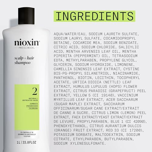 Prepare hair and scalp for a complete hair thickening treatment with Nioxin?s three part System 2 Cleanser for Natural Hair with Progressed Thinning. This professional hair product?s Activ-Renewal technology helps remove sebum, fatty acids and other environmental residue from the scalp and hair. Nioxin?s Derma-purifying shampoo deeply cleanses the scalp and provides thicker, fuller-looking hair. Nioxin?s Shampoo cleanser is the first step of a three part Nioxin regimen, designed to strengthen the hair and amplify hair structure. Professional hair and scalp cleanser, shampoo for natural hair with progressed thinning DERMA PURIFYING SHAMPOO: Deeply cleanses the scalp and provides thicker, fuller looking hair ACTIV RENEWAL TECHNOLOGY: It helps remove sebum, fatty acids and other environmental residue from the scalp and hair Prepare hair and scalp for a complete hair thickening treatment starting with shampoo cleanser NIOXIN SHAMPOO CLEANSER: It is the first step of a three part Nioxin regimen, designed to strengthen the hair and amplify hair structure Award: Behind the Chair Stylist Choice Winner, Favorite Thinning Haircare, 16 consecutive years For Best Results: Apply to wet hair, gently massage into scalp and hair, lather 1 minute, rinse thoroughly, use daily Use in combination with Nioxin System 2 Scalp Therapy Conditioner plus Scalp and Hair Treatment Enroll in Subscribe and Save to ensure you never run out.
