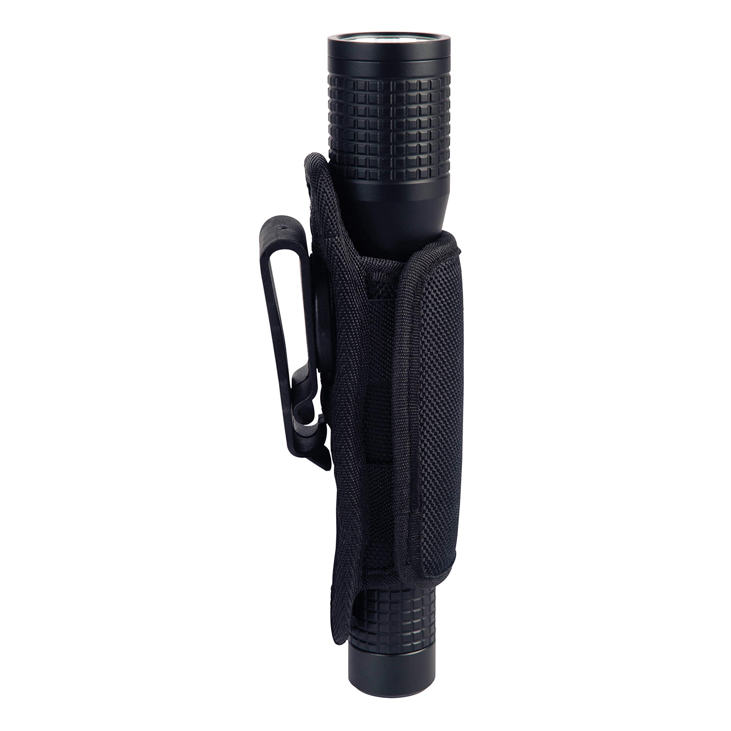 Unique holster that stretches to fit most flashlight shapes – durable clip rotates and locks in 8 positions for shine from the hip function.