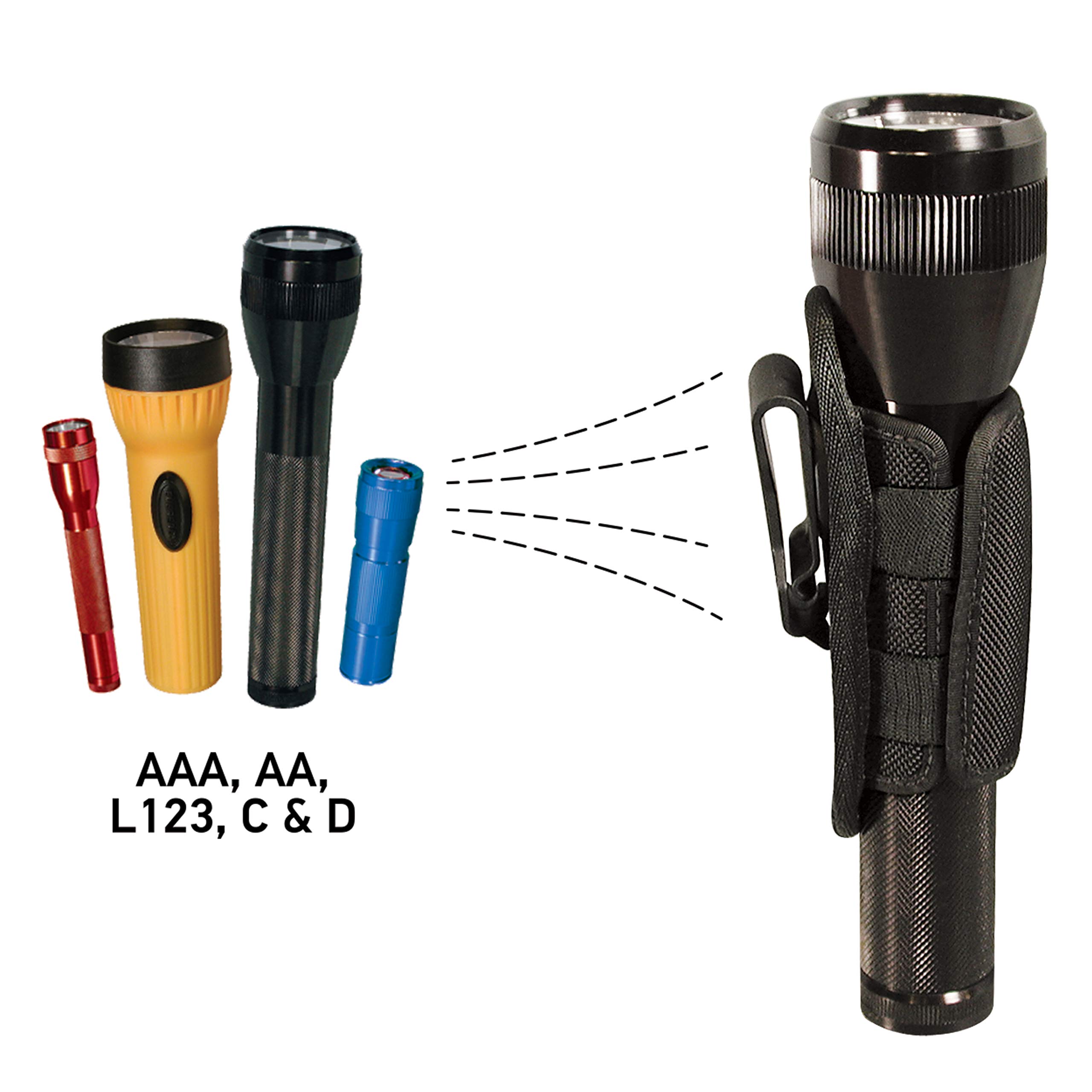 • UNIVERSALLY SIZED FLASHLIGHT HOLDER STRETCHES TO FIT MOST LIGHT SHAPES + STYLES – High quality elastic side panels stretch to securely hold flashlights from AAA models up to D-Cell battery lights