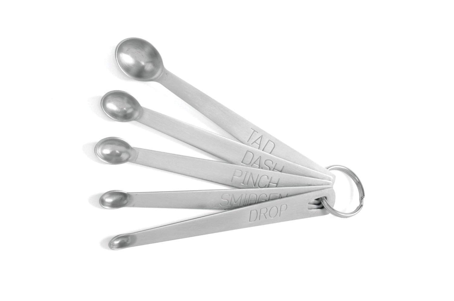 Fun yet useful, 5 stainless steel measuring spoons. Set includes; tad, dash, pinch, smidgen and a drop. Measures 5″ /13cm. Dishwasher safe.
