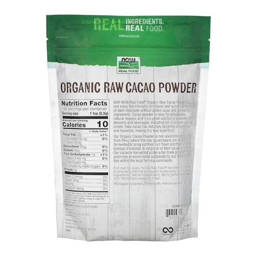 Our Organic Cacao Powder is sourced from Peru, where the raw cacao beans are slowly fermented to bring out their rich flavor and then sun-dried, instead of roasted, to retain all of their valuable nutrients. Our cacao is harvested under a fair trade program that promotes environmental sustainability and fosters strong ties within the local farming community. With NOW Real Food? Organic Raw Cacao Powder you can enjoy the intensely rich flavor and nutritional benefits of dark chocolate without added sugar and unhealthy ingredients. Cacao powder is ideal for wholesome, natural recipes, and it’s a great addition to a variety of desserts and beverages, including hot chocolate and ice cream. Raw cacao has naturally occurring polyphenols and flavonols, making it a true superfood!