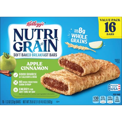 Nutri-Grain Soft Baked Breakfast Bars, Made with Whole Grains, Kids Snacks, Value Pack, Apple Cinnamon, 20.8oz Box (16 Bars)
