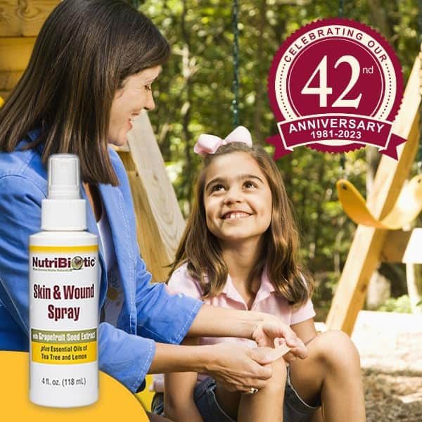 NutriBiotic First Aid Skin and Wound Spray’s natural formulation?is designed to promote healthy tissue and provide protection from unwanted skin conditions.