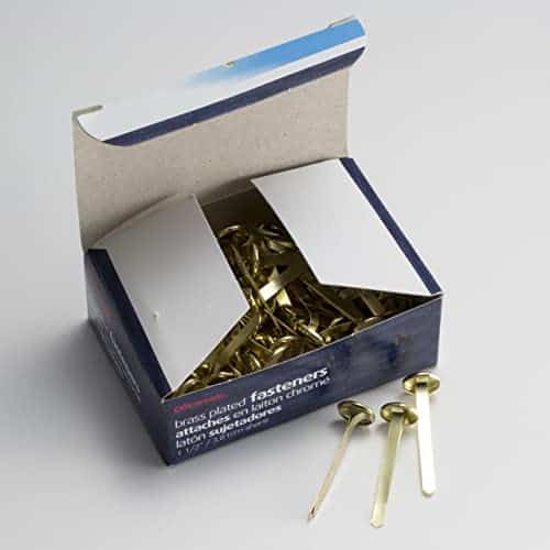 Brass plated fasteners with stiff shanks and sharp points that can pierce several sheets of paper without the help of a punch or press. Makes securing and customizing documents easier. Leaves or tines of the legs are then separated and bent over to secure the papers. 1-1/2′ long shanks with 7/16′ diameter heads. Can be used with large washers OIC 66992. 100/box.