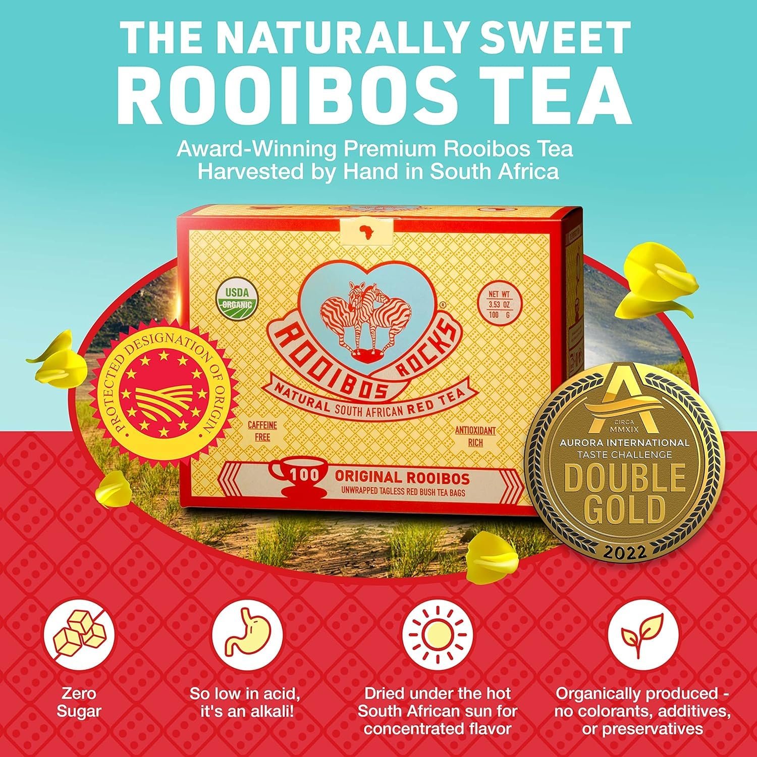 - ?? PREMIUM?QUALITY ORGANIC TEA – We give our assurance that Rooibos Rocks South African Tea is high-quality. Each of our biodegradable tea bags contains pure organic red rooibos tea leaves from South Africa and nothing else – no stems or branches included.