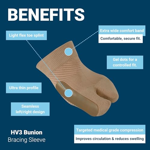 The HV3 Bunion Bracing Sleeve was created using a light-flex toe splint along with an anatomically correct split-toe design to provide relief of bunions, realign toe angles and reduce forefoot swelling. Built-in silicone stabilizers hold the brace in place so the splint can straighten the Hallux and help separate toes for gradual correction, relief and recovery. Fits easily with sandals and inside any shoe, for ease of use. The most comfortable and easy to use Hallux Valgus splint ever made.
