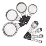 The OXO Good Grips Stainless Steel Measuring Cups and Spoon Set is an elegant yet functional measuring solution. The unique magnetic feature allows you to easily remove one Cup or Spoon at a time. This feature also keeps the Cups and Spoons neatly stacked together for storage. The sturdy, Stainless Steel Measuring Cups and Spoons are designed to make leveling ingredients easy for greater accuracy. The soft, comfortable, non-slip handles feature permanent, etched measurement markings. Set includes tsp, tsp, 1 tsp and 1 T Spoons, Cup, 1/3 Cup, Cup and 1 Cup Measuring Cups.