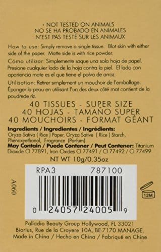 - RICE PAPER BLOTTING TISSUES: Made from natural rice, Palladio’s rice paper sheets are great for absorbing excess oil & keeping your face & makeup looking fresh & clean all day?at home or traveling. Comes in compact packaging & in multiple skin tones.