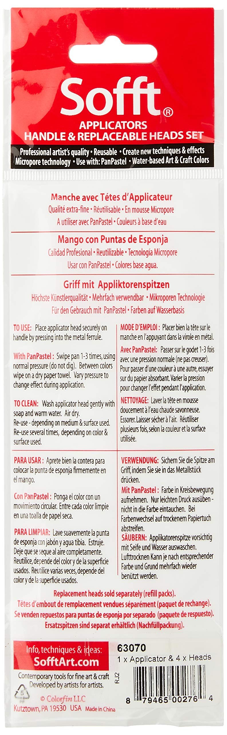 Colorfin Sofft applicators are specifically designed for use with PanPastels and water-based colors. Also used with most water-based art and craft materials to create exciting new techniques, marks and effects. Includes 1 applicator tool and 4 foam heads.