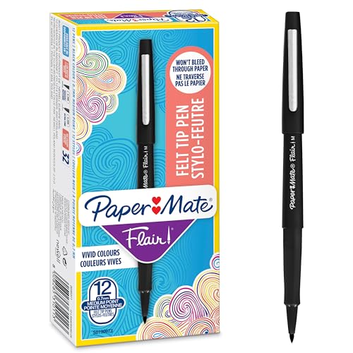 - The box includes 12 Black Paper Mate Flair felt tip pens, Medium Tip