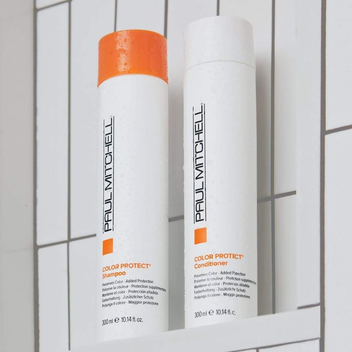 Preserve and protect hair color with Color Protect Conditioner from Paul Mitchell. This daily conditioner detangles and soothes color-treated hair, so strands look and feel soft and hydrated. Sunflower extract helps to protect hair from sun damage to keep color from fading, while conditioning extracts moisturize hair and boost shine. Hair Type: Ideal for Color-Treated Hair. Fragrance: Refreshingly energetic scent with notes of orange, apple and bergamot. Color Safe. Vegan. Paraben Free. UV Protection.