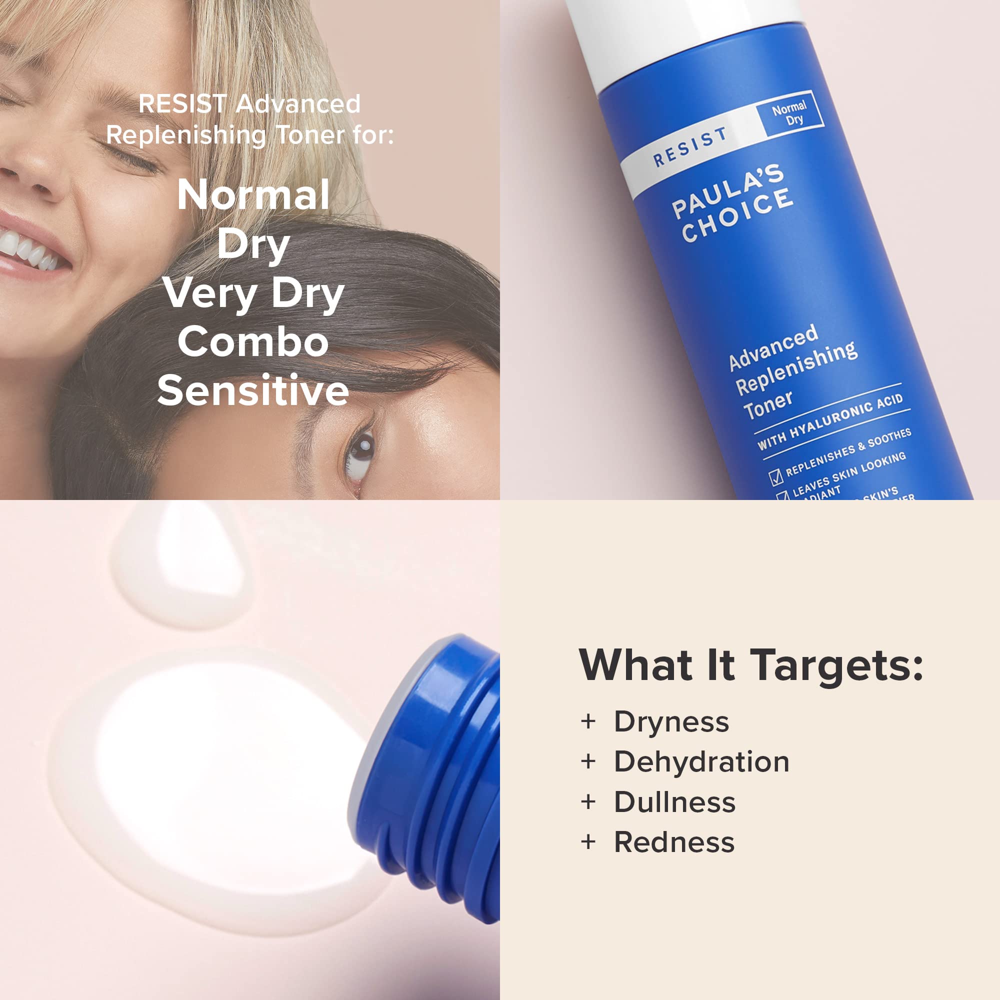 • Paula’s Choice RESIST Advanced Replenishing Anti-Aging Toner is fortified with antioxidant vitamins to protect your face from environmental stress and damage. It visibly reduces fine lines and wrinkles while promoting a smooth and even facial texture.
