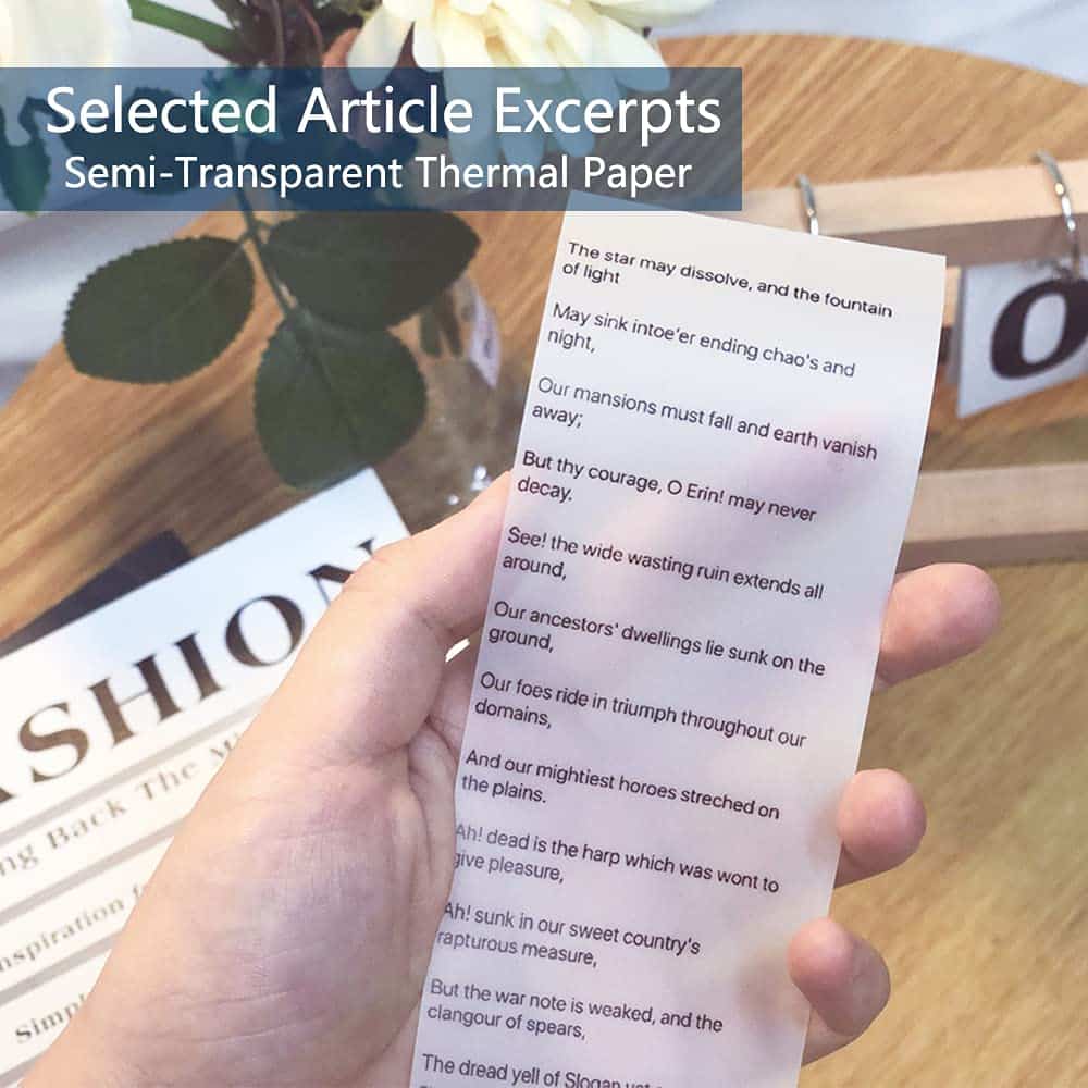 - Semi-translucent Matte Texture- This is a semi-translucent roll of paper. It looks like frosted and feels very comfortable. Make the printed picture more special. For plan journal, organization, diy creation,work plan, memo, meeting notes,study notes, shopping list. Suitable for office, students,artist, teacher, etc. Make your life interesting.