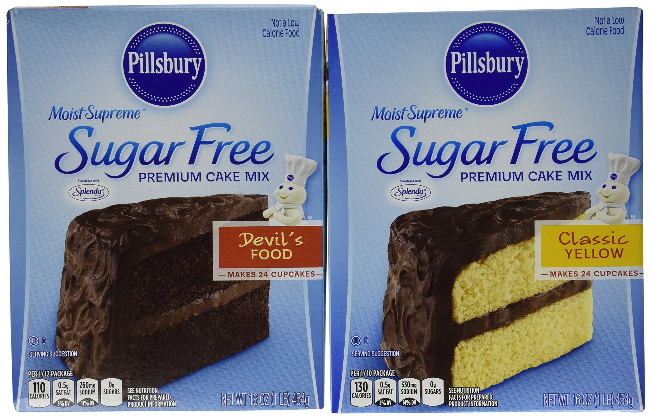 Enjoy classic Pillsbury cake mix without the sugar. Made with Splenda. 1 box each of Devil’s Food and Classic Yellow.