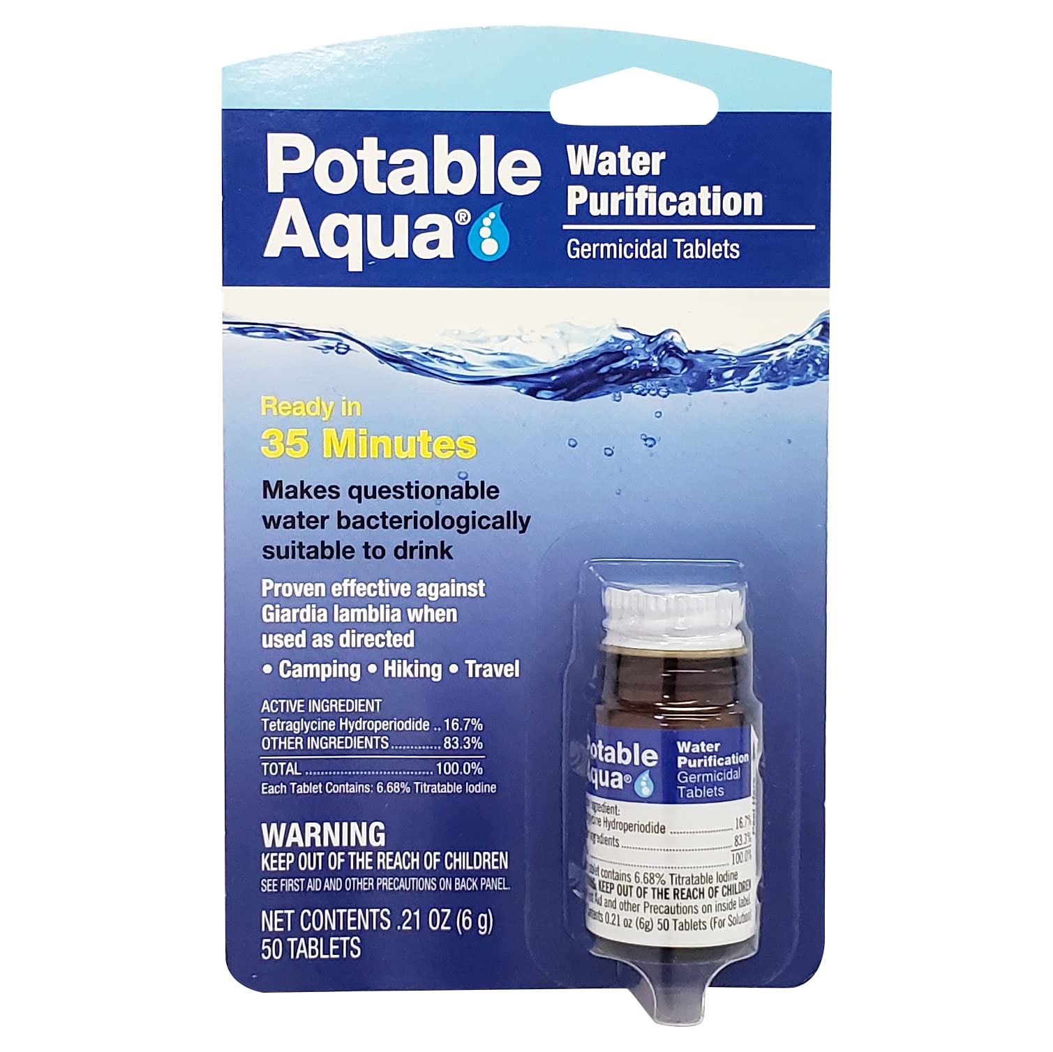 Potable Aqua Water Purification Tablets are essential for outdoor adventure, camping, hiking and emergency water preparedness. These travel water purification tablets make questionable water bacteriologically suitable to drink, even in emergency water purification situations. These water purification tablets for drinking water, are effective against Giardia lamblia when used as directed. Easy to use, ready in just 35 minutes. 50 tablets per bottle treats 25 quarts of water. When it comes to water treatment tablets and emergency water purification, Potable Aqua is a trusted name in water treatment for drinking water. Use portable water purification tablets for travel and disaster preparedness as directed on the label.