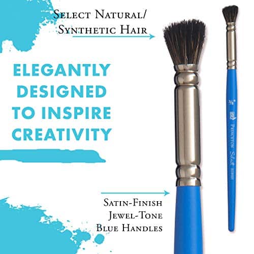 PRINCETON ARTIST BRUSH-Select Natural/Synthetic Hair Brush: Deerfoot. This series of brushes are perfect for your decorative and technique painting needs. A variety of synthetic and natural hair, the short handled select brushes with their distinct shapes allow you to truly express your creativity. The satin-finish jewelry box blue handles are the icing on the cake for these unique specialty brushes. This package contains one natural/synthetic hair deerfoot brush in size 3/8 inch with a 6-1/2 inch handle. Imported.