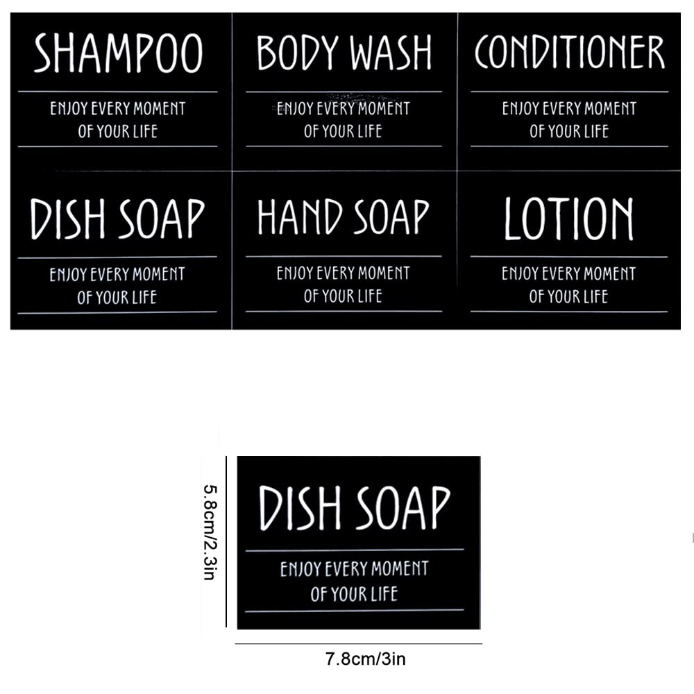 Quantity: 24pcs, each kinds labels 4pcs Size: 7.8*5.8cm/3*2.3in Use for: dish soap/body wash/conditioner/shampoo