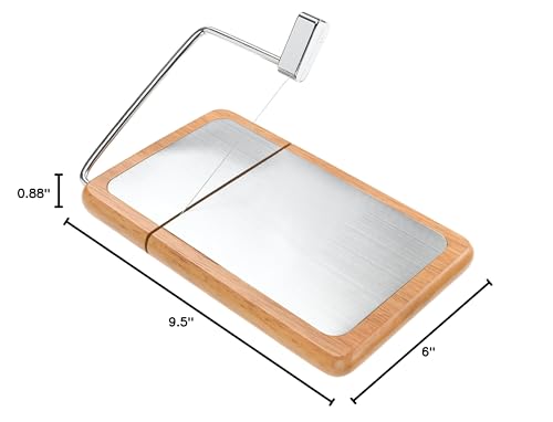This handsome combination of natural Beech wood and brushed stainless steel will be admired by all. The built-in stylish chrome arm and handle grip has a stainless steel cutting wire that sinks easily into even the hardest cheese, to a perfect slice, thick or thin, every time. As with all of our cheese slicers, the wire is replaceable and has a lifetime against breakage. Board measures 9 ?? x 6? and has non-slip rubber feet.