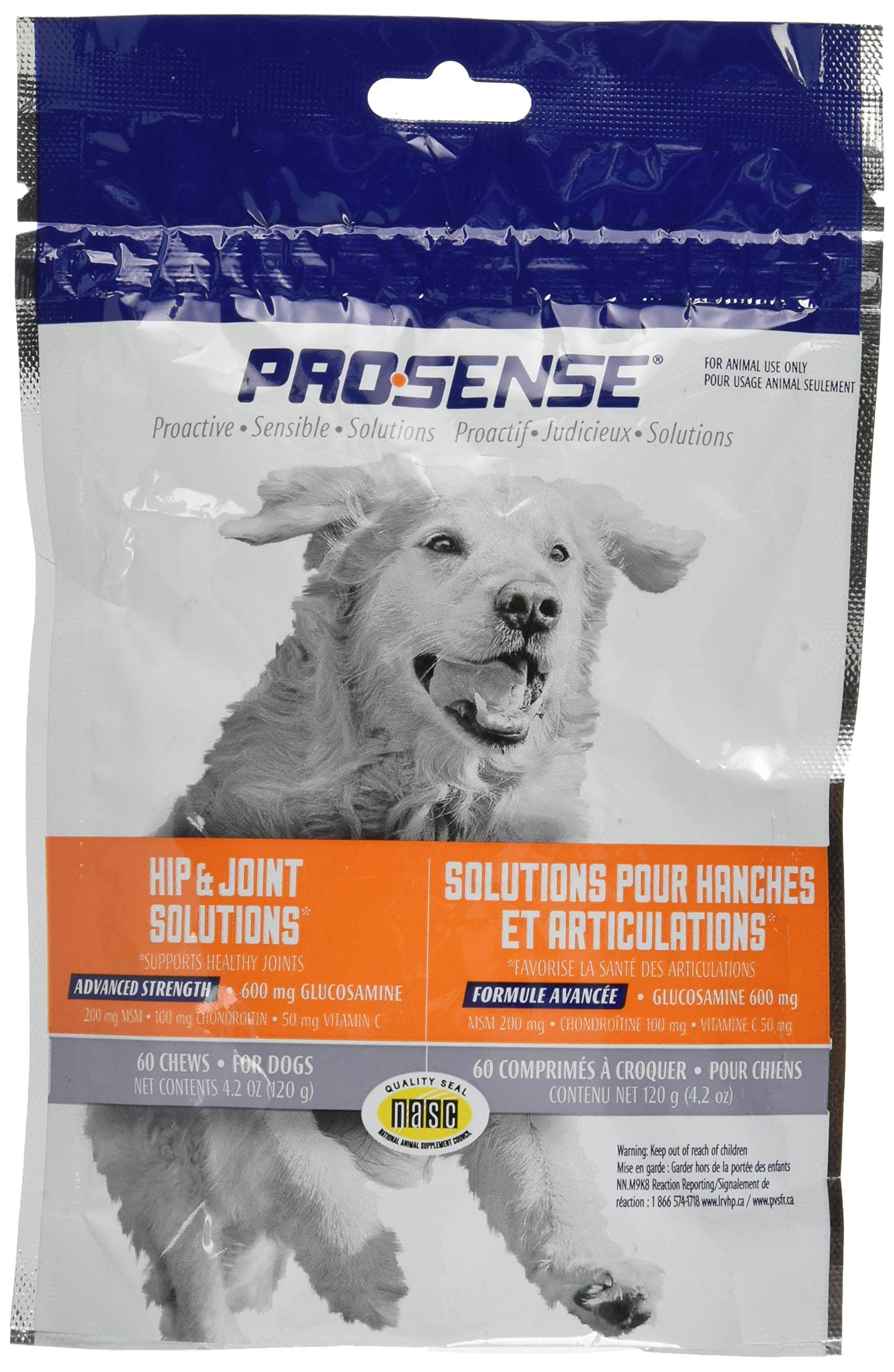 Pro-Sense Hip & Joint Solutions for dogs supports healthy joints with 600 mg of glucosamine combined with 200 mg MSM, 100 mg chondroitin and 50 mg Vitamin C per two chews. This advanced strength formula helps support healthy joint function and is suitable for everyday use for dogs of all sizes. Give during meals or after your dog has eaten to reduce incidence of gastrointestinal upset.