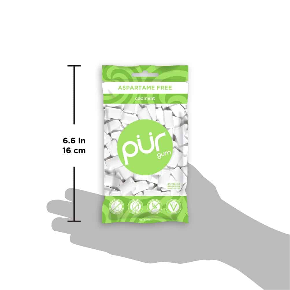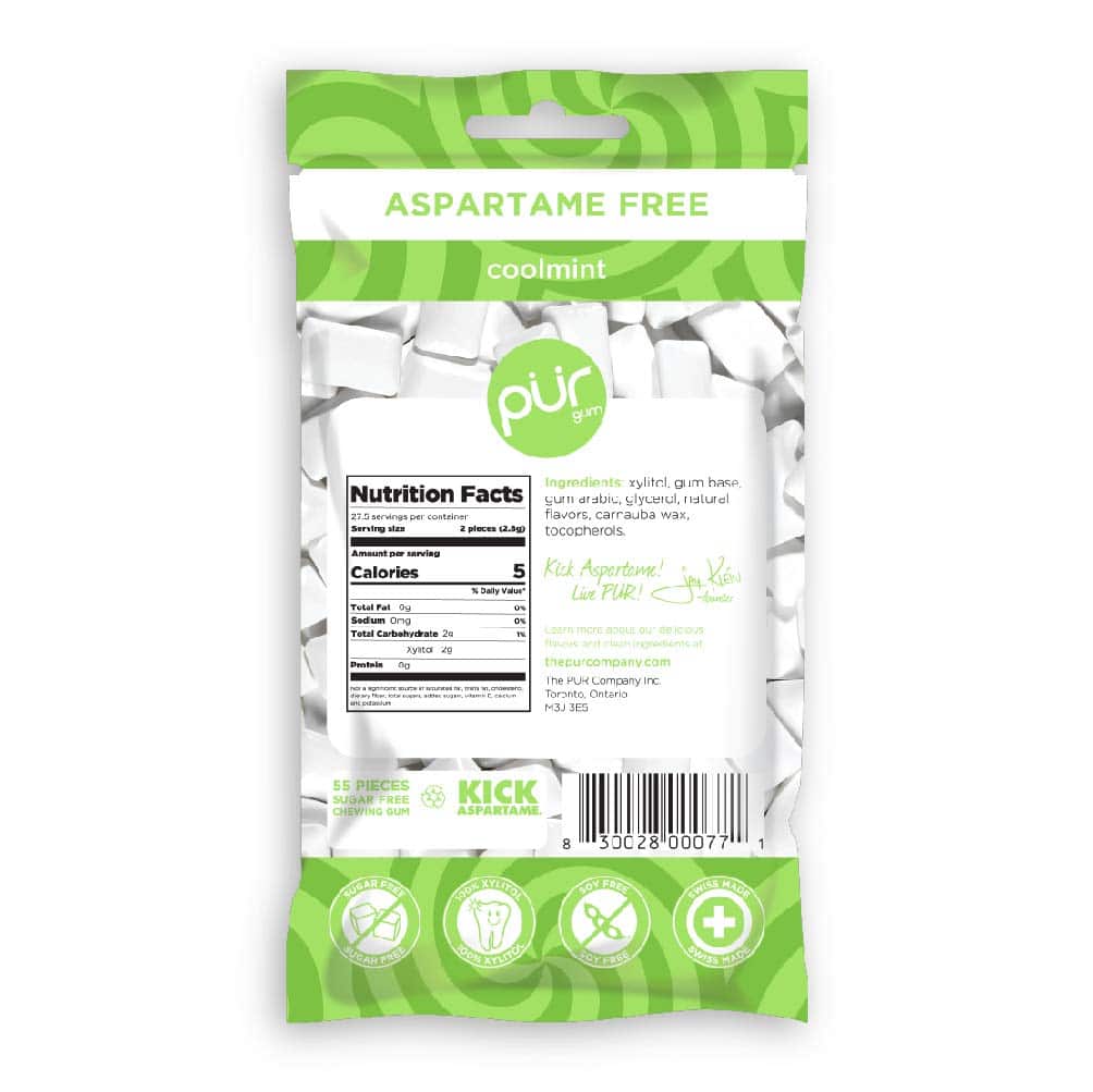 PUR cool mint Gum, Aspartame-free and Diabetic Friendly, 60 pieces – Sugar free chewing gum, with sweeteners Ingredients: sweetener: xylitol, gum base, gum Arabic, glycerol, natural flavors, carnauba wax, tocopherols.