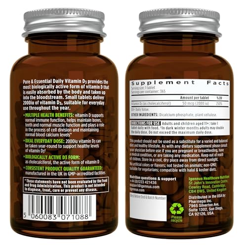 Original price was: ₹3,132.₹2,320Current price is: ₹2,320.Pure & Essential Daily Vegetarian Vitamin D3 2000iu, Cholecalciferol, 365 Small Tablets, 1-A-Day 1-Year Supply, by Igennus