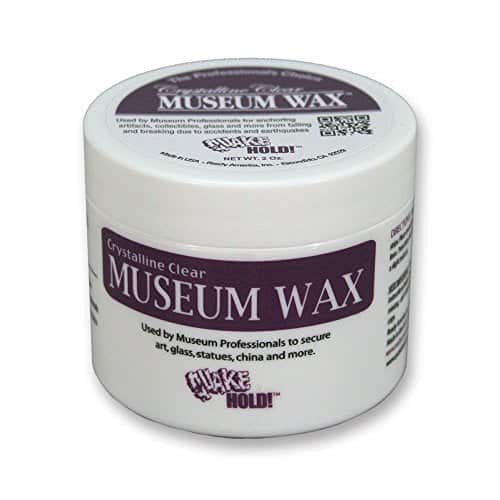 Museum Wax is the same formulation used by museum conservators. Removable, reusable and non-toxic. Great for securing antiques and collectibles from falling and breaking. Scoop out a small amount with the pick provided and roll into balls, or strips and apply to base of object. Press object to surface. To remove, twist and lift from the base.