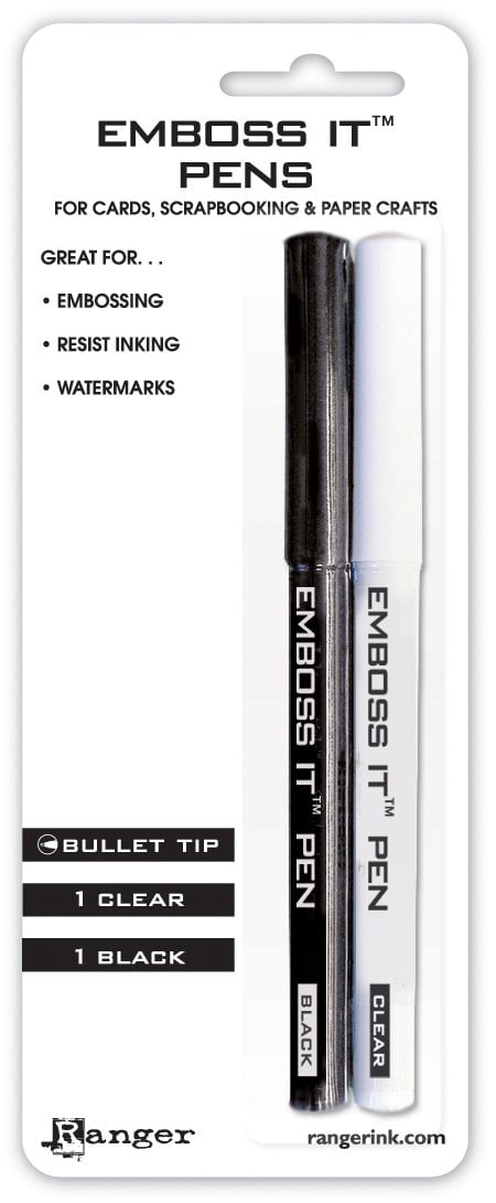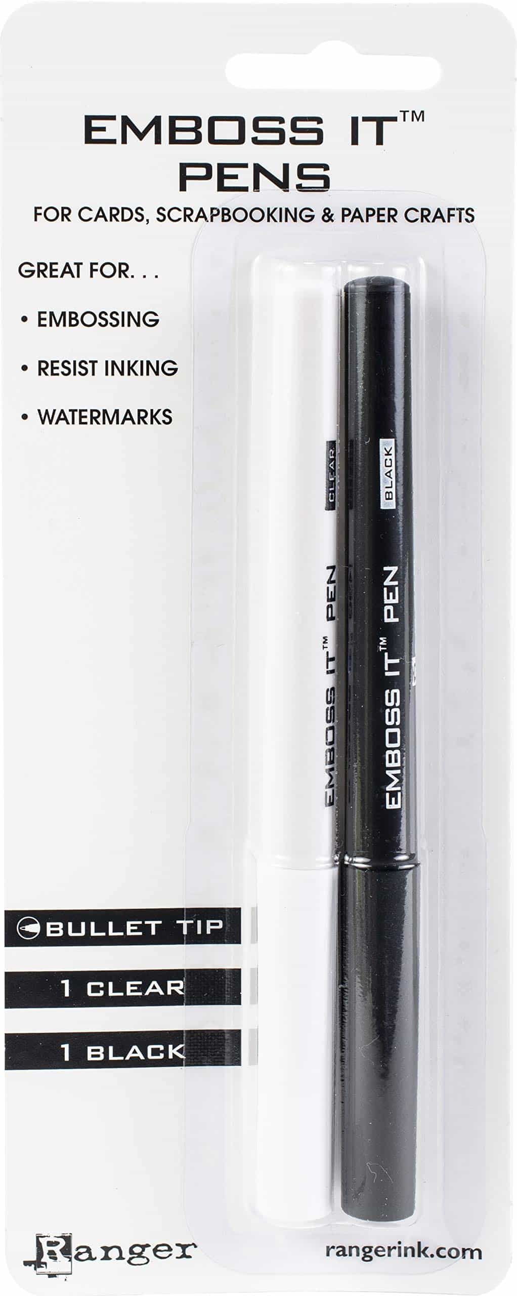 These fabulous pens contain A specially formulated ink that stays wet on paper, providing the tack needed to attract and retain embossing powders until they are cured with heat. These pens are perfect for Scrapbooking, rubber stamping, paper crafting, and even Altered arts! Great for resist inking and watermarks also! This package contains two Ranger Inkssentials Embossing Pens, (1) each: clear and black. Acid free, bullet tip. Made in USA.
