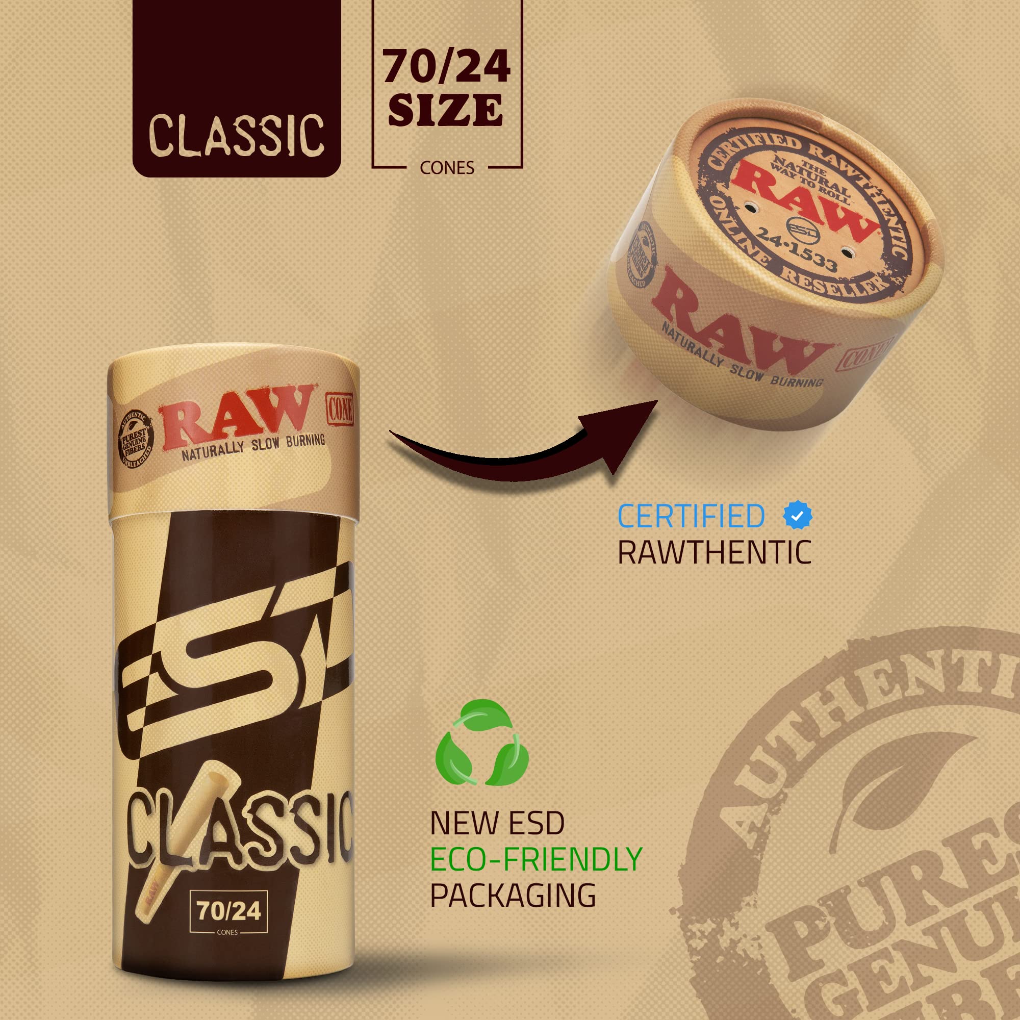 Official Authorized and Certified RAW Online Reseller ESD Sources RAW Cones Directly from RAW! Authenticity is GUARANTEED!Save Time!These RAW cones save you time because they come pre-rolled so you get the full experience without needing to waste time rolling. These are perfect for people who find it a challenge to hand-roll as well as for experienced rollers to optimize their time. Cones are the ultimate convenience because you only need to fill them up with whatever you like to smoke, twist off the end, and light upAll NaturalRAW is pure, less processed rolling paper, unlike anything that you have ever seen or smoked. RAW Paper is made from 100% plants and unlike certain others contains no added chalk or dye! This is paper the way it was meant to be, and every puff allows you to truly taste and enjoy your smoke.100% MONEY BACK GUARANTEEwe will fully refund any customer not 100% satisfied with their purchase no questions asked. What do you have to lose? Add to your cart now!