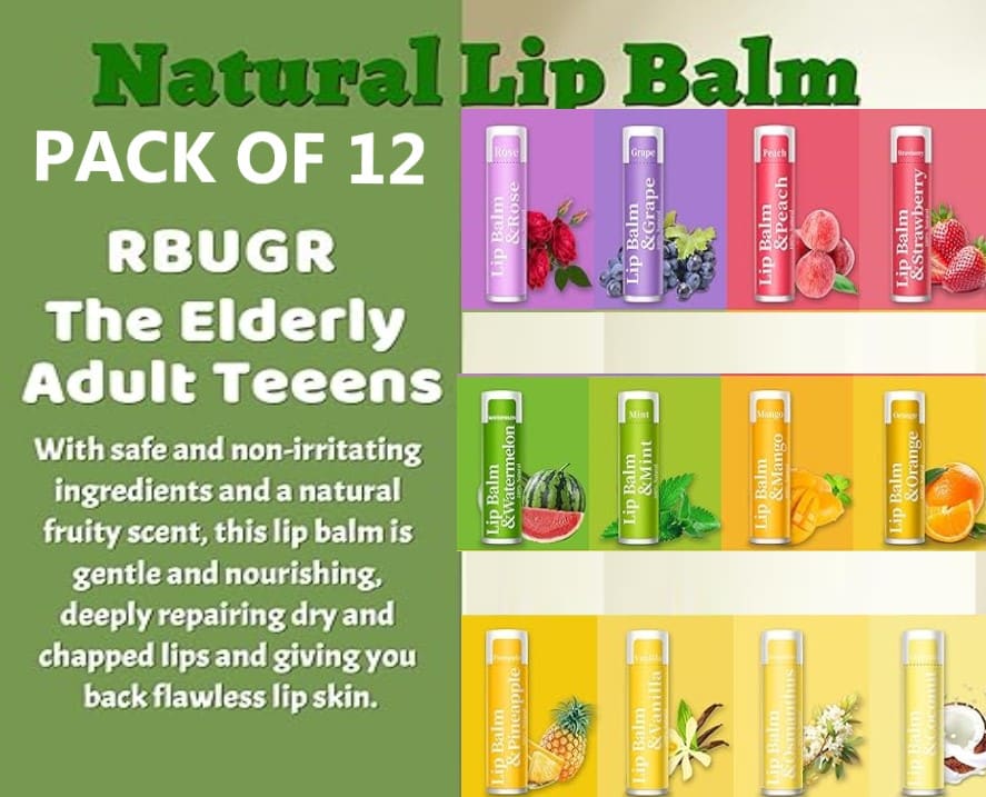 Pamper your lips with RBUGR Natural Lip Balm Pack of 12 Flavours from the USA, crafted to deliver deep moisturisation, nourishment, and long-lasting lip care. Made with organic, skin-friendly ingredients, these lip balms help heal dry, chapped, and cracked lips while keeping them soft, smooth, and healthy all day long. Each lip balm features a lightweight, non-sticky formula that glides effortlessly and locks in moisture, providing everyday protection against dryness caused by weather changes, pollution, and dehydration. This assorted flavour pack offers a delightful lip care experience with 12 refreshing and sweet flavours: