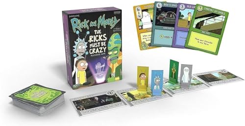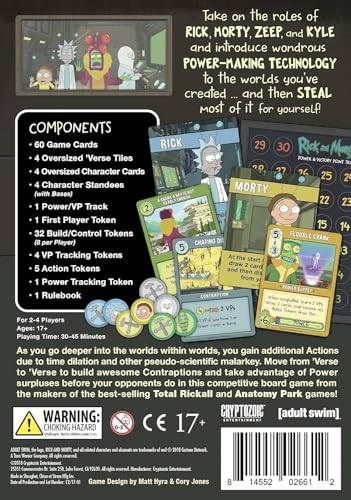 Take on the roles of Rick, Morty, Zeep, and Kyle and introduce wondrous Power-making technology to the worlds you’ve created. and then steal most of it for yourself. That is, if your opponents don’t get to it first! This is an engine-building game (of sorts) that takes place in the four locations (“`Verses,” we call them) from the popular episode “The Ricks Must Be Crazy”: the Rick verse, Microverse, Miniverse, and Teenyverse. Due to time dilation and other pseudo-scientific malarkey, the lower you travel in the `Verses, the greater number of Actions you’ll have each round. But some of those lower `Verses are a bit primitive, so the Contraptions you build to use all that sweet Power might not work so well! During your turn, you’ll spend your Actions to build Power Supplies and Contraptions and even move to a new `Verse to take advantage of some excess Power there. At the end of each round, the Power generates from the bottom ‘Verse up, and players can use that Power as it travels from `Verse to `Verse to play One-Shot abilities, use Character Abilities, and power-up their Contraptions. Player order matters in each `Verse, so hopefully your opponents left you some Power to use!.