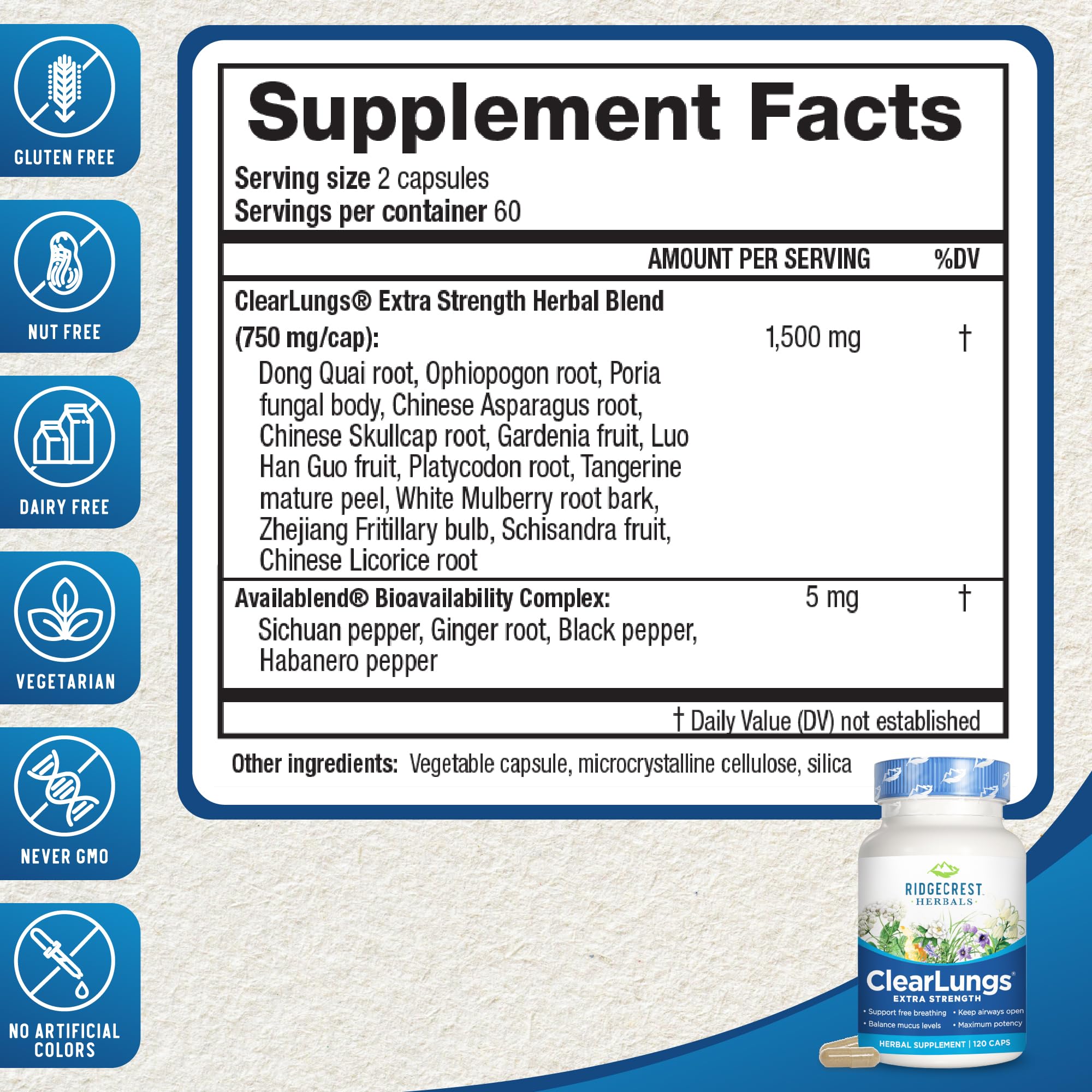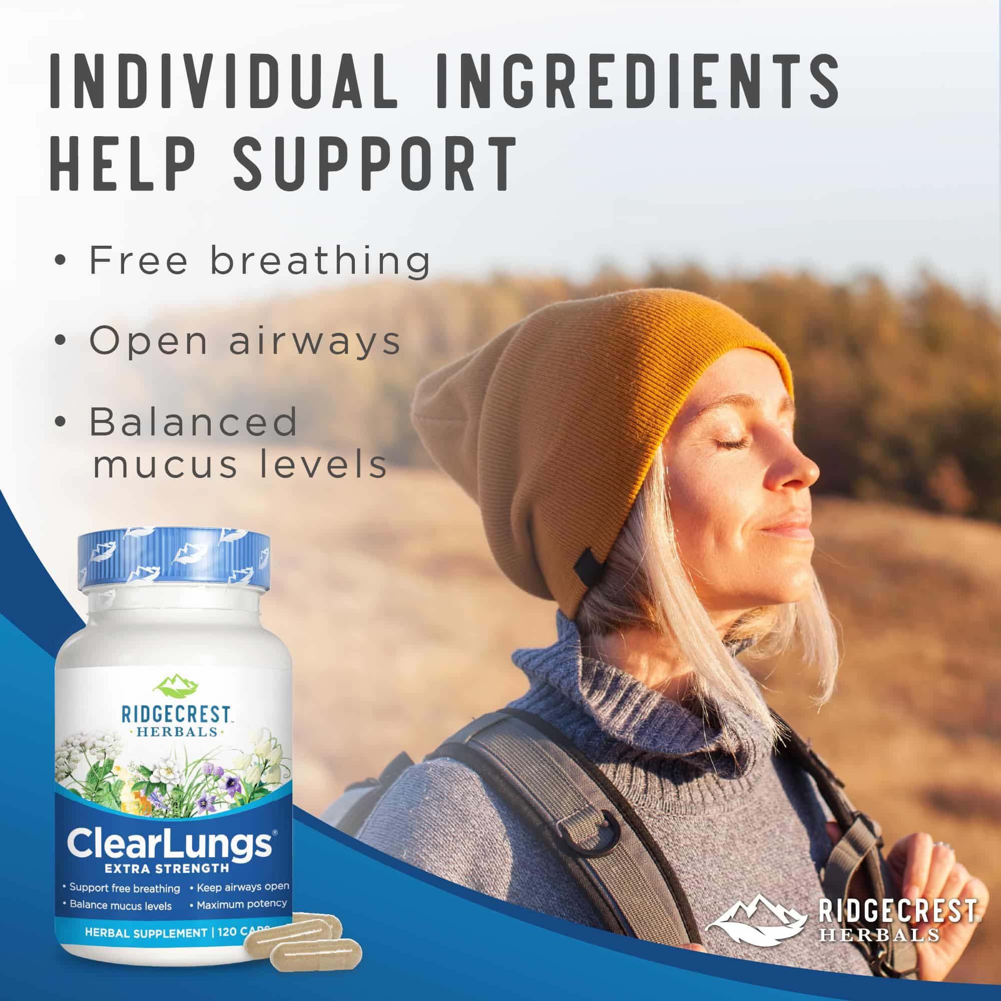 Ridgecrest Herbals ClearLungs Extra Strength, Natural Lung, Nasal Health Formula, Bronchial, Respiratory, Sinus, Mucus Support (120 Caps, 60 Serv)