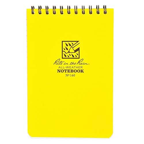 The Yellow 4″ x 6″ top-spiral notebook is small enough to fit comfortably in your pocket and tough enough to survive any of Mother nature’s onslaughts. This scrappy pocket notebook will survive rain, sweat, mud, Snow, oil, and grease. The non-glare white paper is legible in bright sunlight. The impact-resistant Wire-O binding won’t lose its shape. The polydura cover defends your notes from scratches and stains. Rite in the Rain All-Weather Writing Products have been made in Tacoma Washington, USA since 1916. Recycle Rite in the Rain paper with standard papers. Recycle the entire notebook using most curbside programs (paper, plastic, & metal). Simply separate the Wire-O from the cover prior to recycling for easier processing.