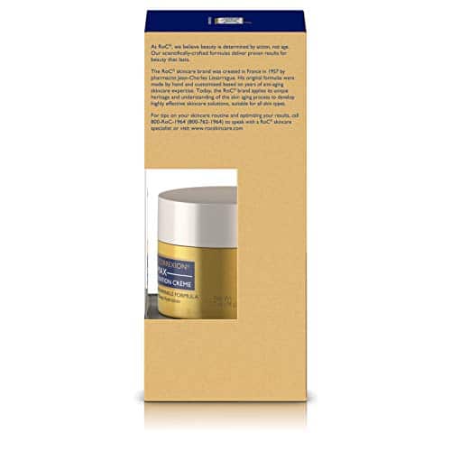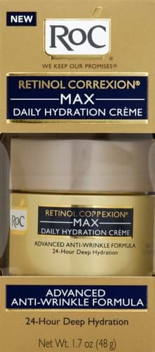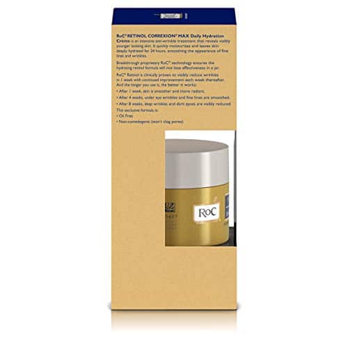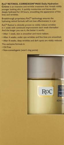 RoC Retinol Correxion Max daily hydration creme, rejuvenating formula reveals radiant, smoother-looking skin after just one week.Clinically proven to visibly reduce wrinkles in one week. Smooths the appearance of fine lines, wrinkles, and dark spots. RoC Technology ensures formula will not lose its effectiveness in the jar. Oil-free and non-comedogenic formula won’t clog pores.
