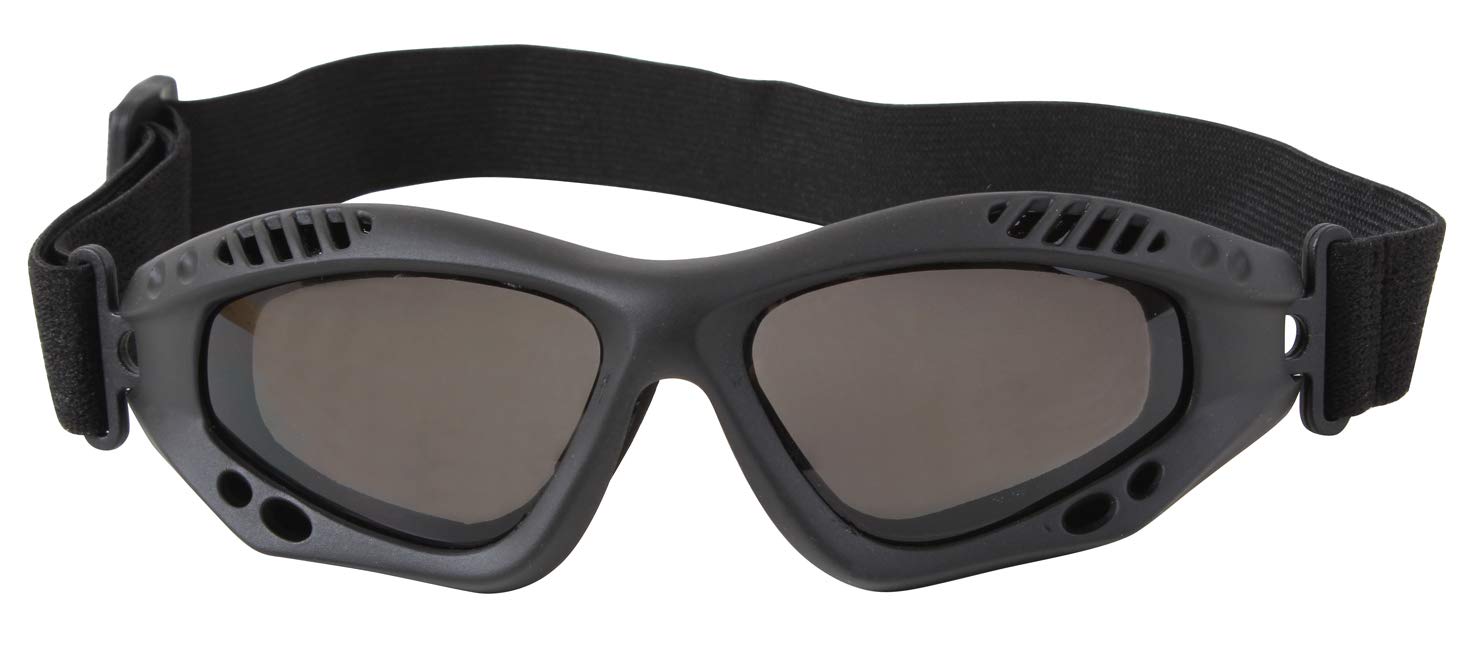 Protect your eyes in any number of situations, whether tactical or military in nature, or simply on an outdoor adventure. These rugged black goggles have a lightweight, padded frame with smoke gray, shatterproof polycarbonate lenses with anti-scratch and anti-fog coatings, and SPF 400 ultraviolet protection. A comfortable and adjustable one-inch elastic strap holds them securely in place.