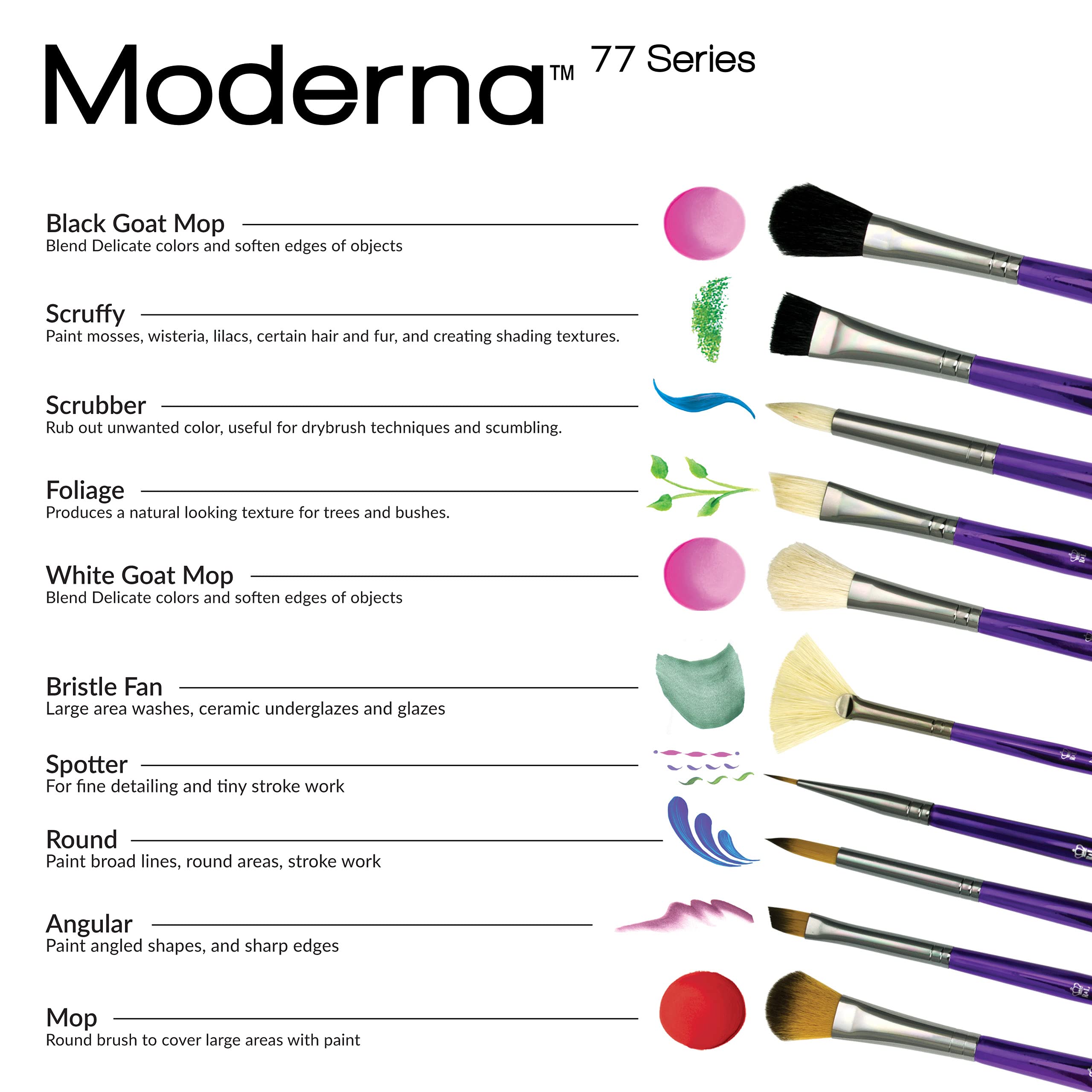 - MIXED MEDIA BRUSH SET – Moderna 77 Series is a bold and beautiful collection designed to work exceptionally well for all painting mediums. Perfect for painters of all skill levels.