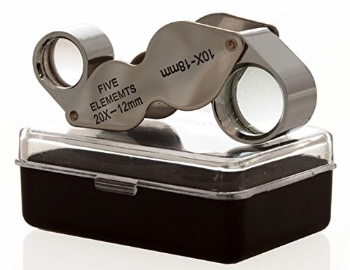 Improve your detailed viewing with this compact and easy to use eye loupe optical tool that has dual power 10x and 20x magnification. It is great for crafts, fine detail work, jewelry, watches, inspecting antique markings, coins, and many other items that require magnification to identify and view detail. The loupe has a two swing-away chrome plated covers. The SE Dual Power 10x and 20x Jeweler’s Loupe includes a plastic storage case that measures 2-5/8″ x 1-7/8″ x 7/8″. One side 20x magnification with a 12 mm glass lens. The other side has 10x magnification with an 18 mm glass lens.